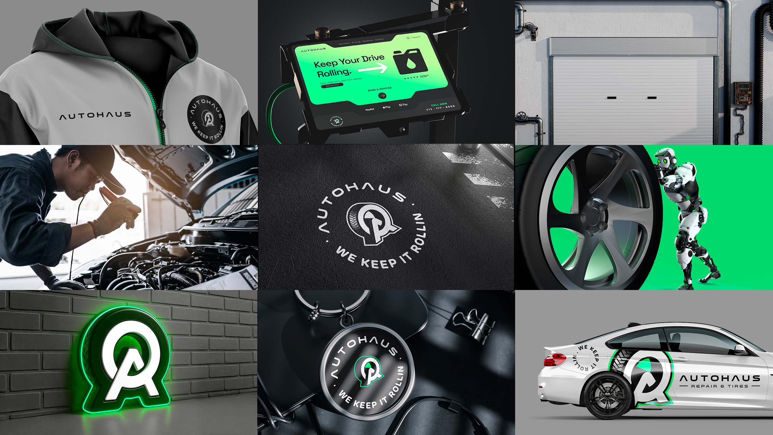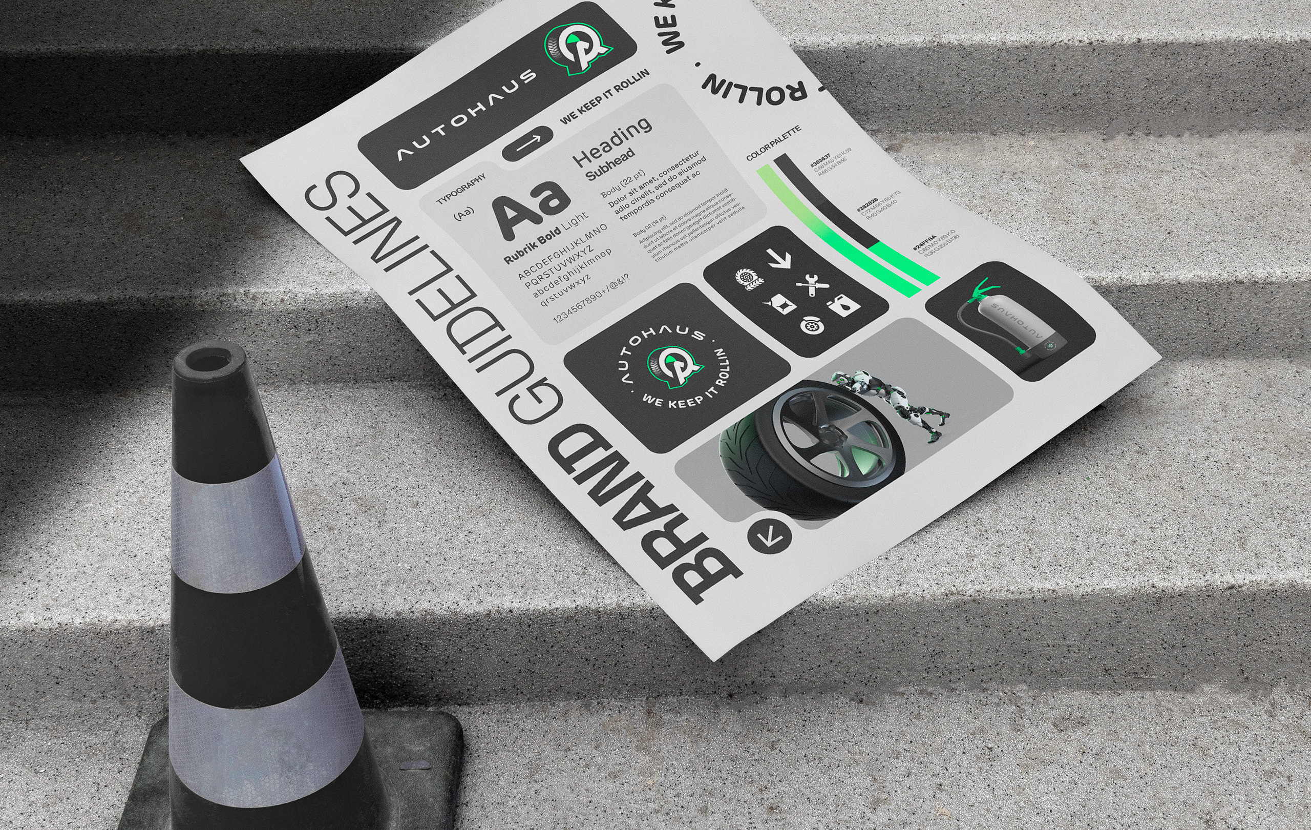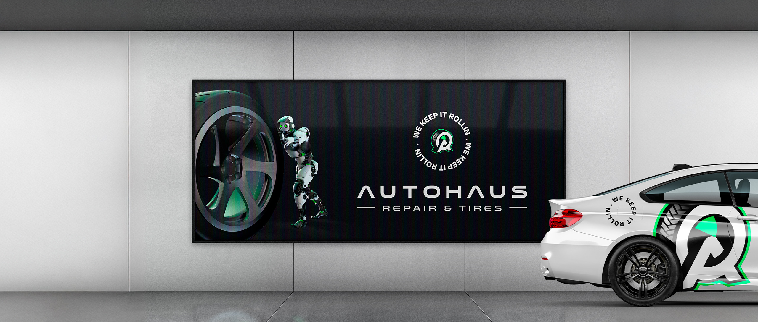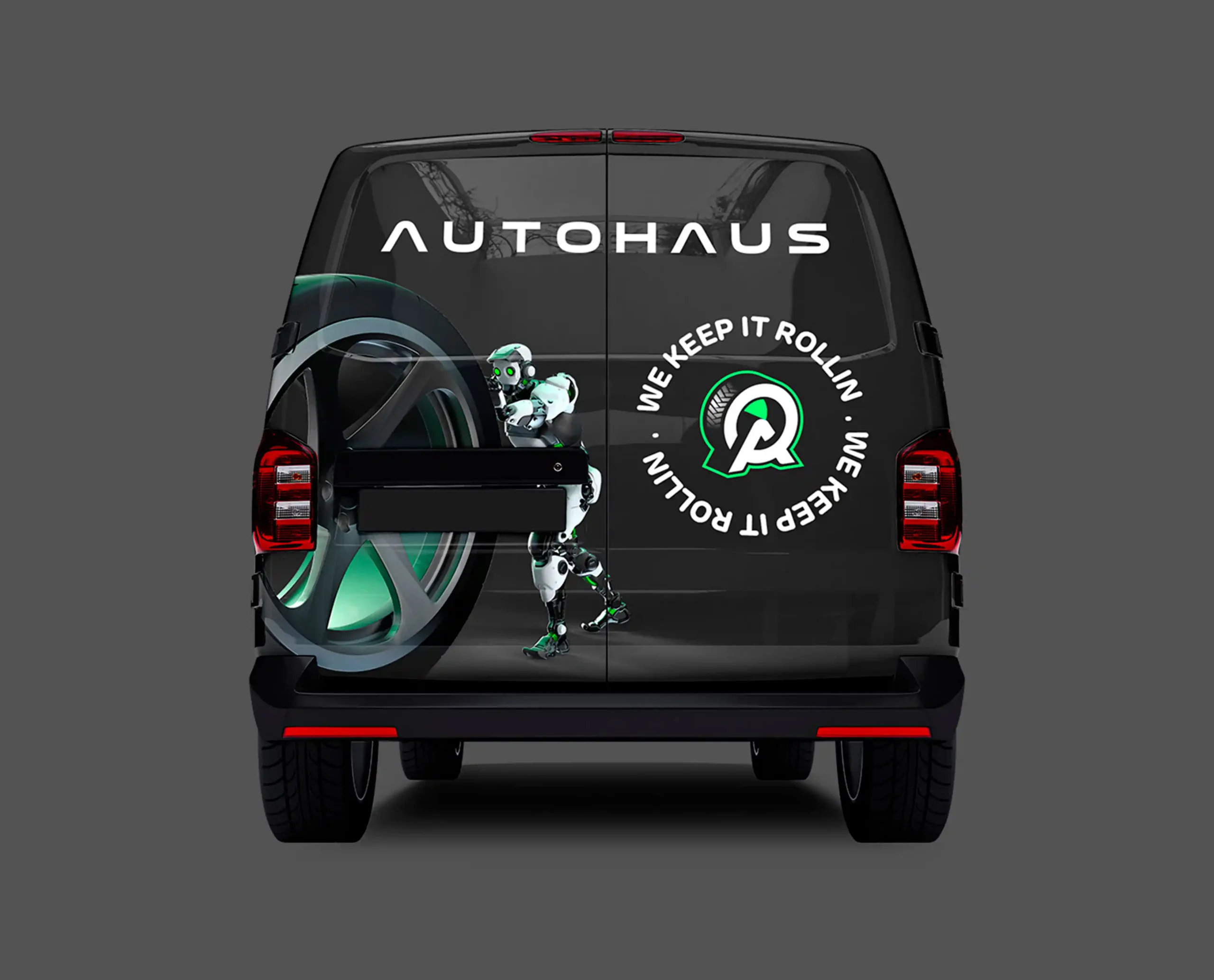 Sur le terrain, Autohaus prend vie : véhicules habillés, outils siglés, affichages muraux et packagings techniques.